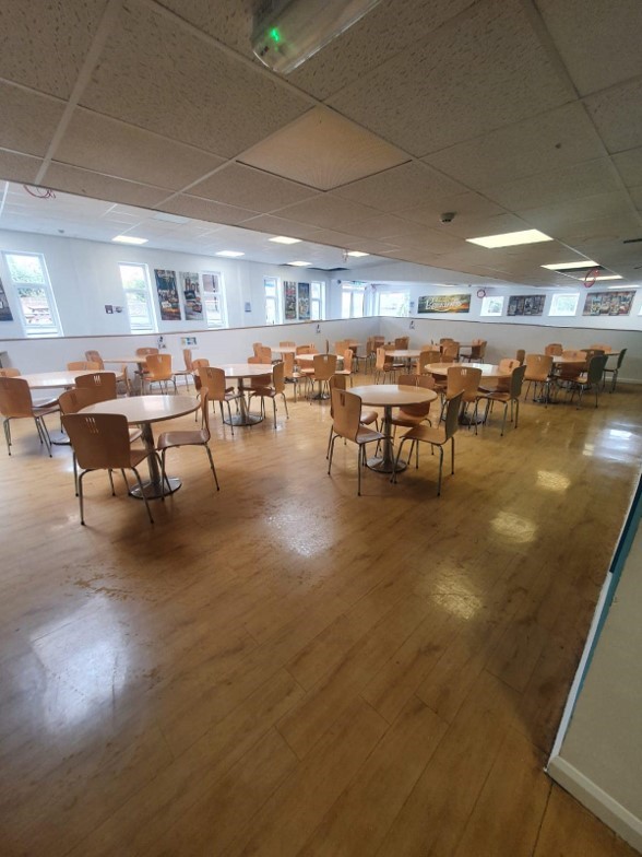 This is an example of a post construction clean of the student canteen at the University of Plymouth, which involved a deep clean and a hygiene clean, as well as stainless steel cleaning, floor buffing and polishing.